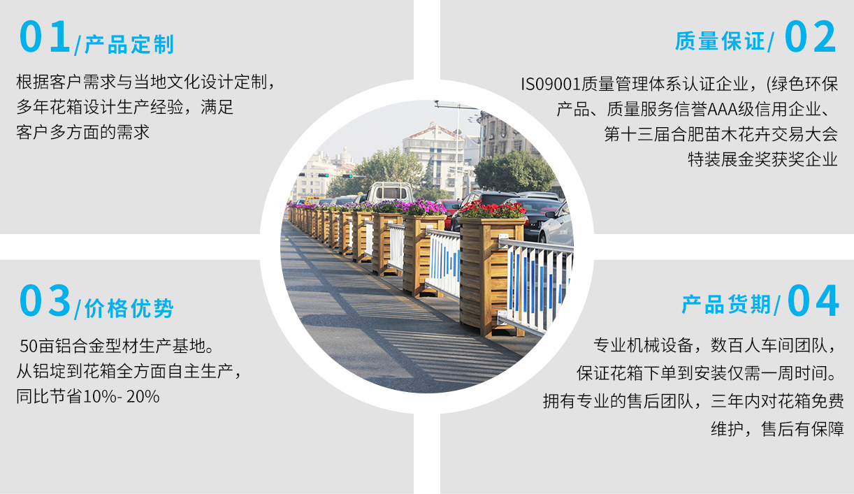 •       上海曦信環(huán)保科技股份有限公司成立于2013年,是一家專業(yè)的馬路花箱供應(yīng)商。本公司自成立以來,經(jīng)歷了奠定基礎(chǔ),穩(wěn)步發(fā)展的過程。品牌已形成市場優(yōu)勢,現(xiàn)正處于乘勢而上發(fā)展壯大的階段。創(chuàng)立先進的經(jīng)營理念和企業(yè)文化,生產(chǎn)經(jīng)營規(guī)模不斷發(fā)展壯大。公司主要從事馬路花箱,花箱護欄,木紋鋁合金花箱,座椅花箱,鋁板花箱、不銹鋼花箱、鋁合金護欄、鋁合金葡萄架,公園座椅,戶外果皮箱垃圾桶、鋁合金葡萄架等金屬建材產(chǎn)品的生產(chǎn)和銷售...